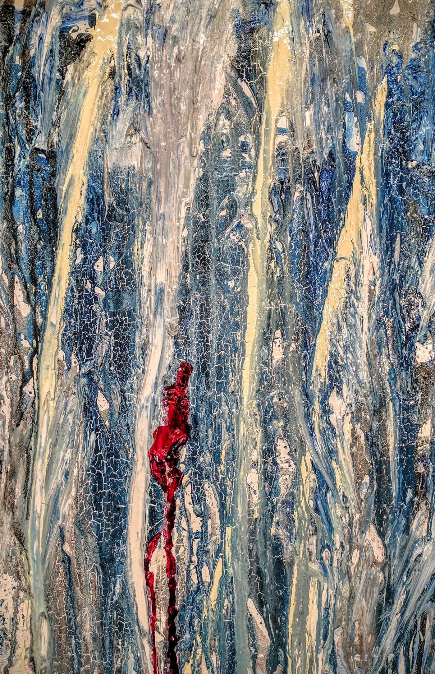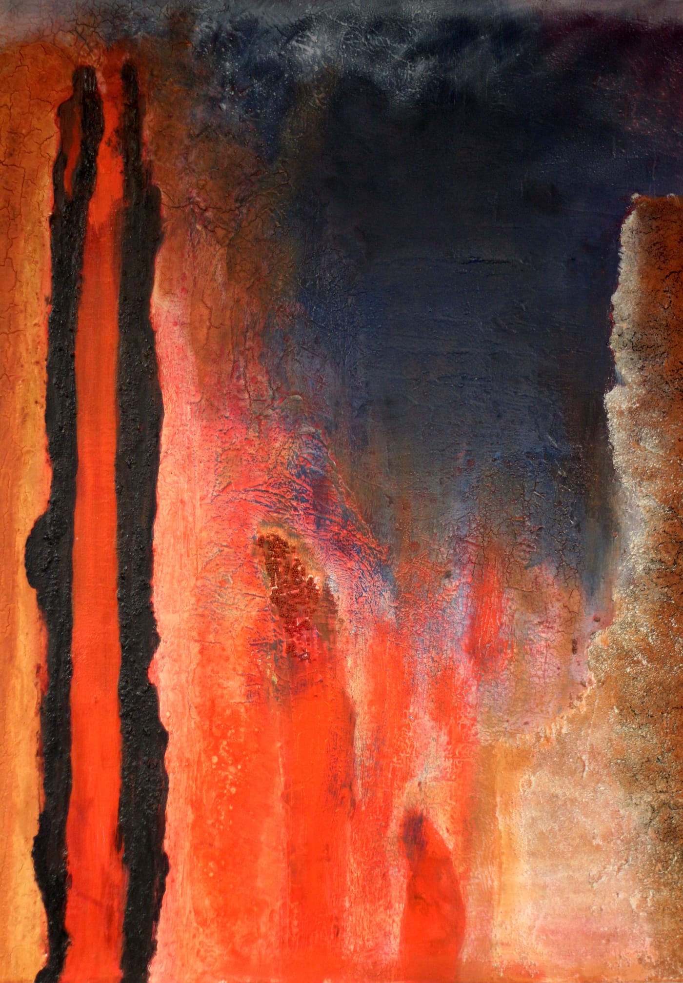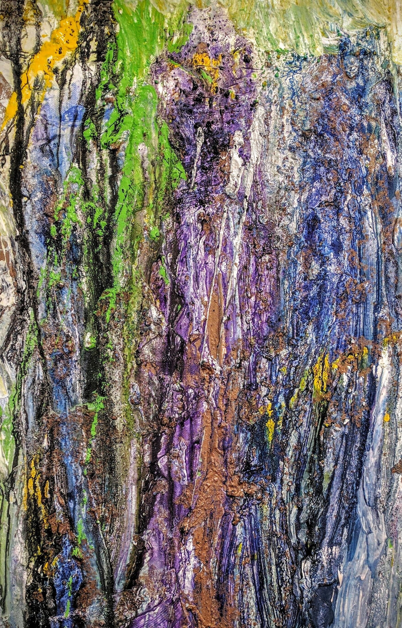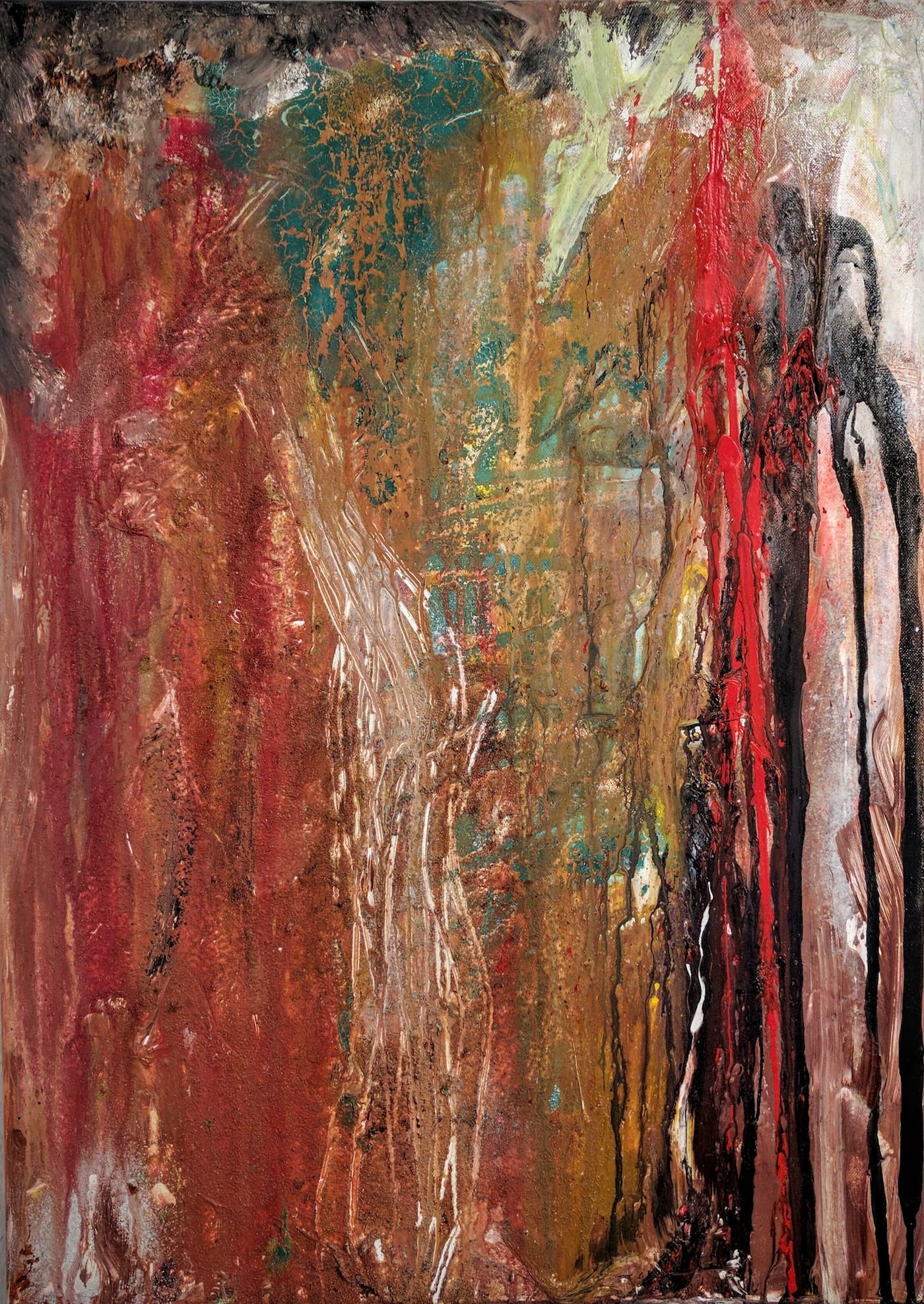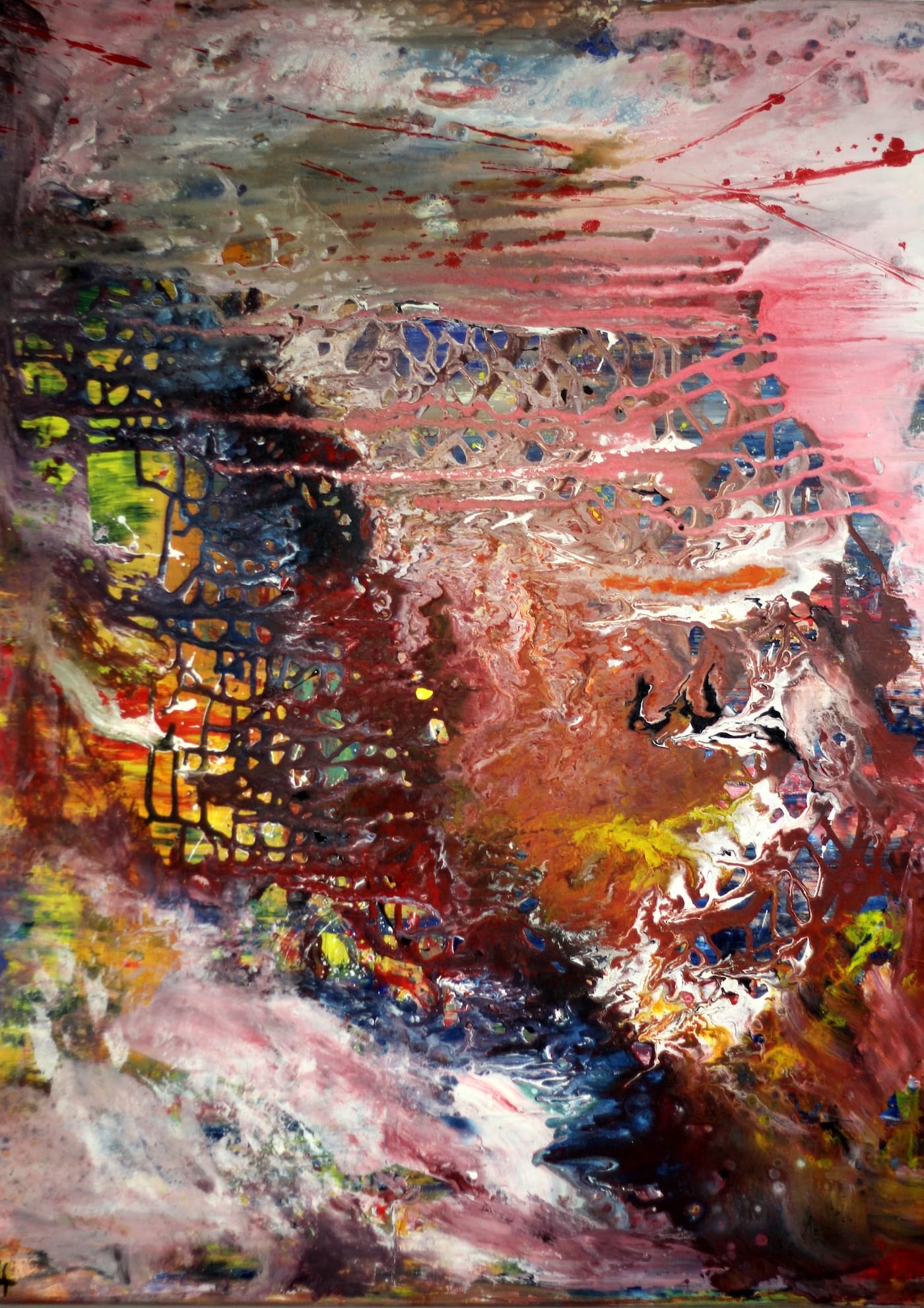 Sie sehen durchbrochene Flächen, aufgelöste Ränder, Linien, die aus fließender Farbe entstanden sind, nebeneinander gesetzte, nicht klar konturierte „Flecken“, dicke Krusten, übereinander liegende Gewirre aus farbigen Bahnen, Spuren, die von Pinseln stammen, aber auch von Rakeln, Messern, Spachteln. Und wenn Sie näher treten, werden Sie zum Teil körnige Partien erkennen, die verraten, dass der Farbe hier etwas beigemischt wurde. Kaffeesatz kann das sein, aber auch Rost, Sand, Gips…