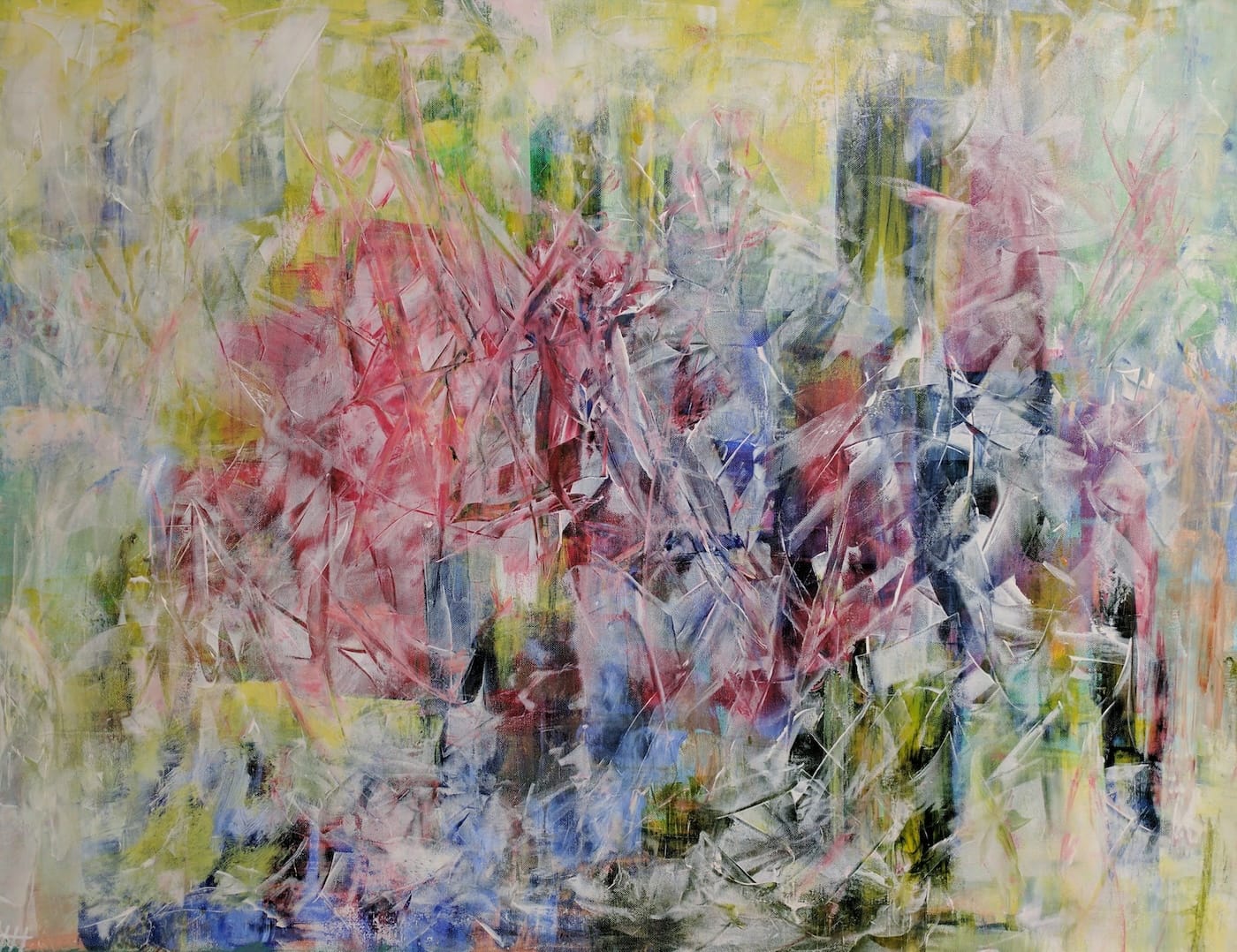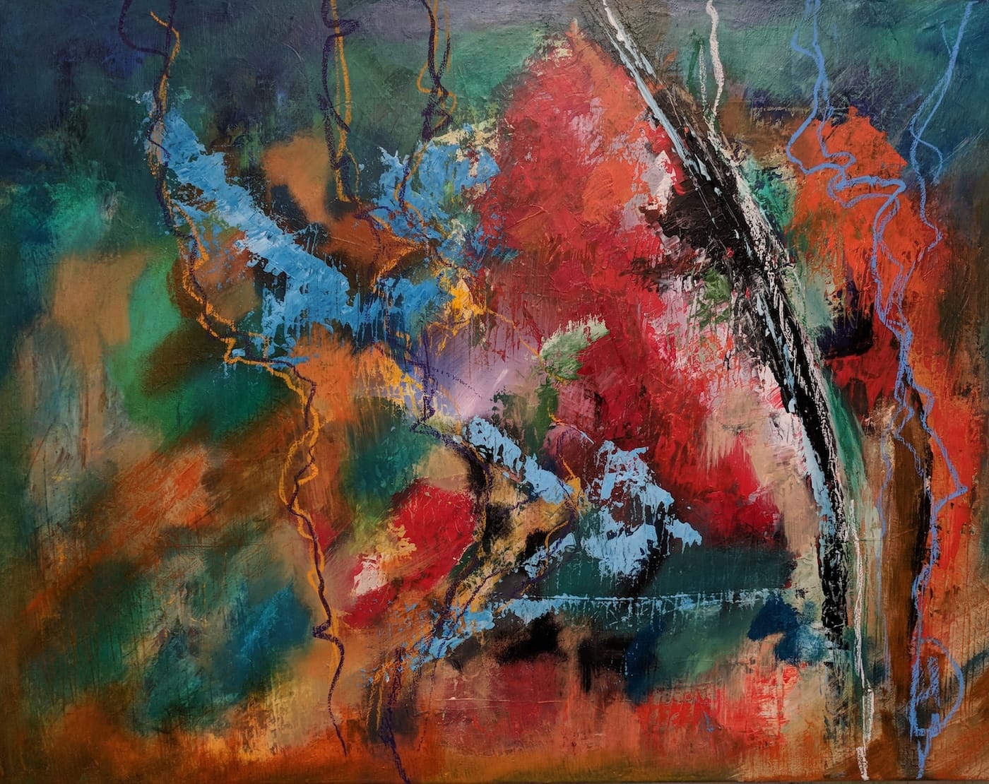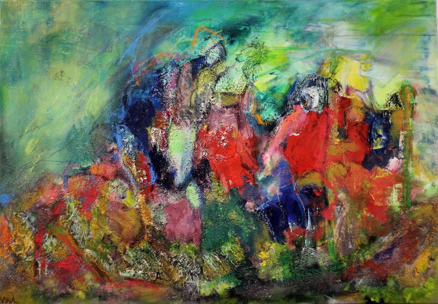 Es handelt sich – bis auf zwei kleine eindeutig landschaftliche Ausnahmen – um abstrakte Bilder. Bilder, die sich dem sogenannten Informel zugehörig fühlen. Diese Kunstrichtung, das Informel, kam in der Zeit nach dem 2. Weltkrieg in Europa auf und spielte, anders als andere abstrakte Kunstrichtungen, nicht mit klaren geometrischen Formen, sondern mit dem freien Fluss von Linien, Farben und Texturen. Die Formlosigkeit wurde zum Inbegriff dieser Richtung. Doch schauen wir nicht auf den historischen Ursprung, sondern auf das, was wir hier vor Augen haben.