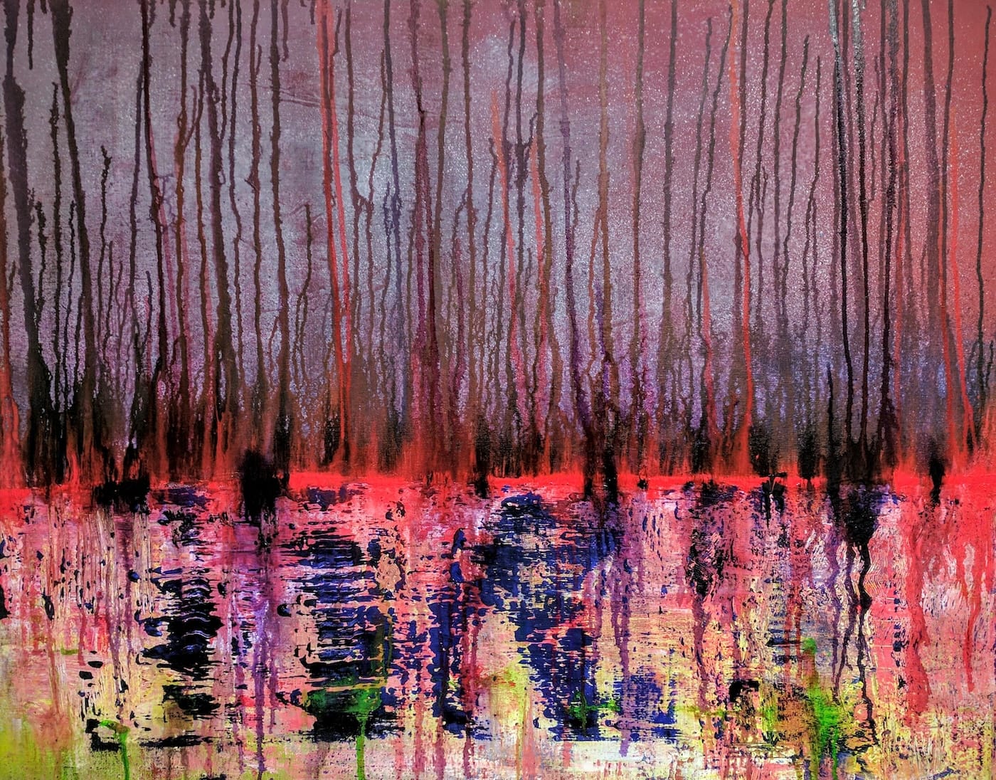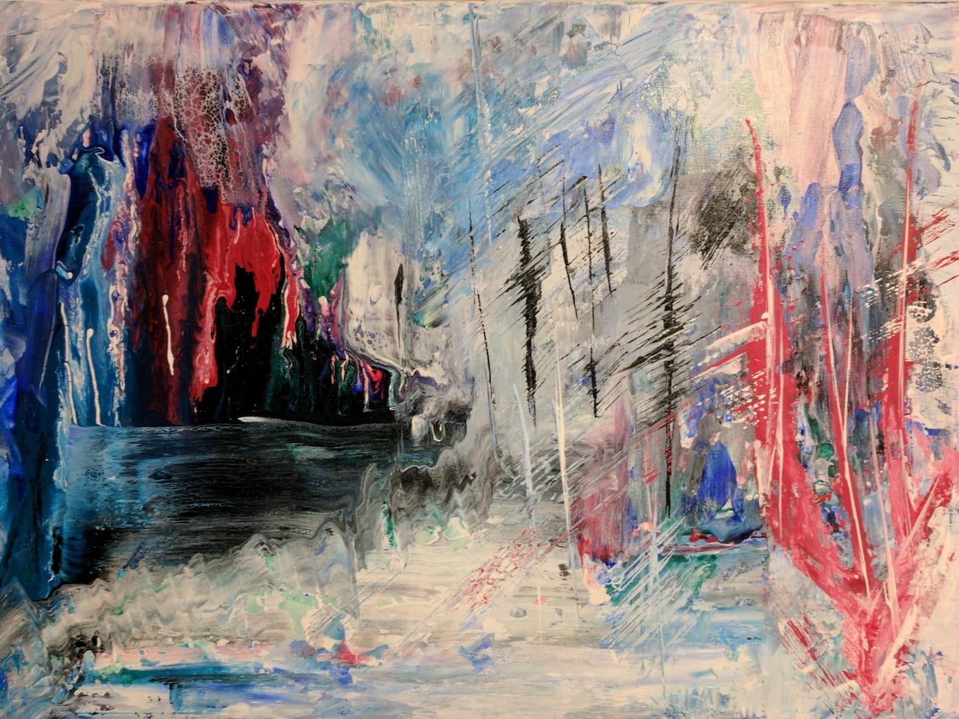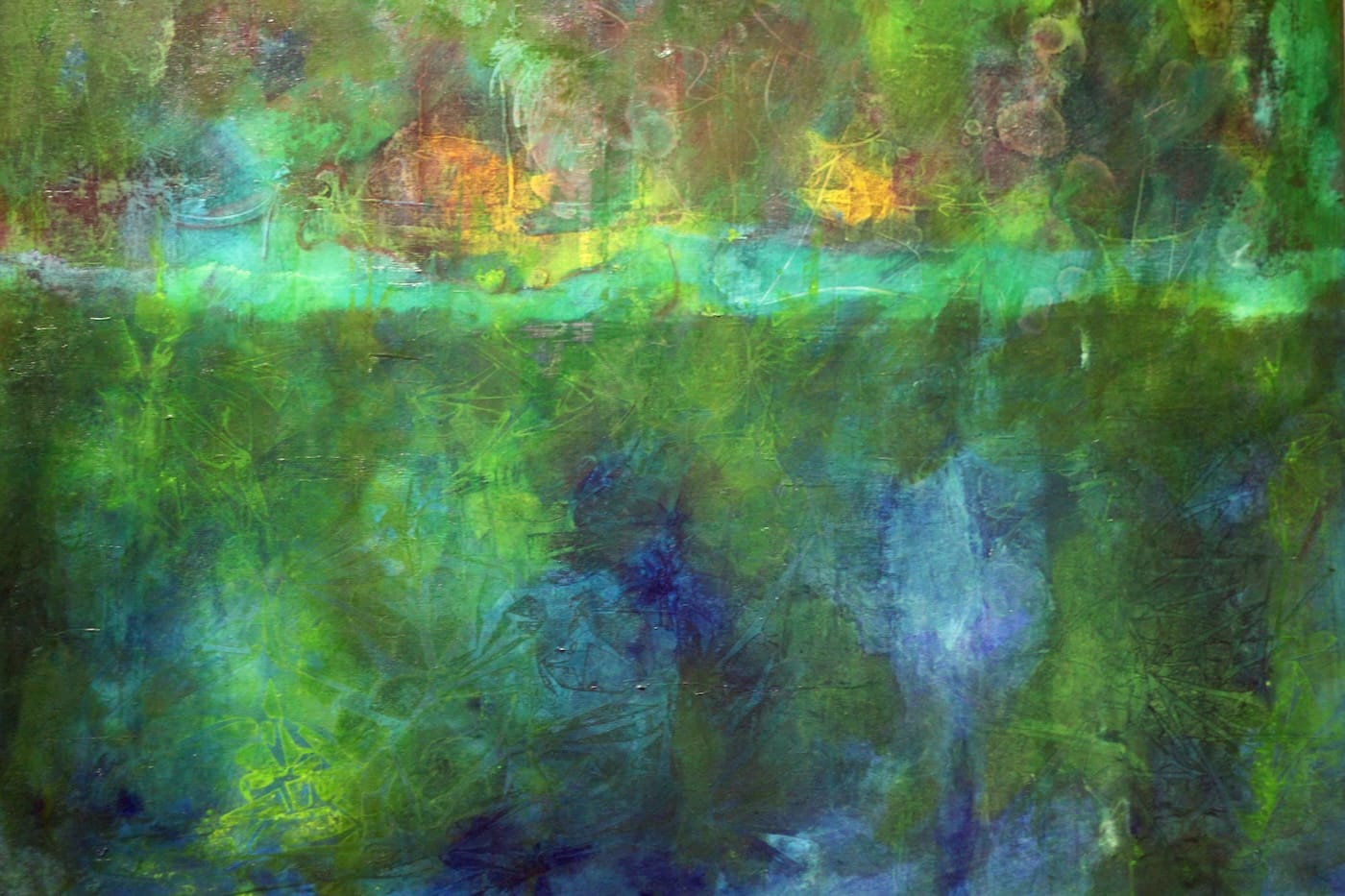 Es handelt sich – bis auf zwei kleine eindeutig landschaftliche Ausnahmen – um abstrakte Bilder. Bilder, die sich dem sogenannten Informel zugehörig fühlen. Diese Kunstrichtung, das Informel, kam in der Zeit nach dem 2. Weltkrieg in Europa auf und spielte, anders als andere abstrakte Kunstrichtungen, nicht mit klaren geometrischen Formen, sondern mit dem freien Fluss von Linien, Farben und Texturen. Die Formlosigkeit wurde zum Inbegriff dieser Richtung. Doch schauen wir nicht auf den historischen Ursprung, sondern auf das, was wir hier vor Augen haben.